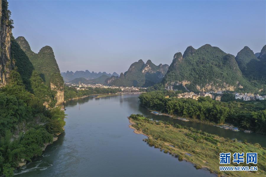 這是在廣西桂林市陽朔縣興坪鎮拍攝的風光(5月19日攝,無人機照片)。“蒼蒼森八桂,茲地在湘南。江作青羅帶,山如碧玉篸……”一千多年前,唐朝詩人韓愈寫盡桂林山水之美。初夏時節,在廣西桂林市陽朔縣興坪鎮,藍天白云下,煙雨朦朧中,桂林山水盡顯秀美。新華社記者 周華 攝