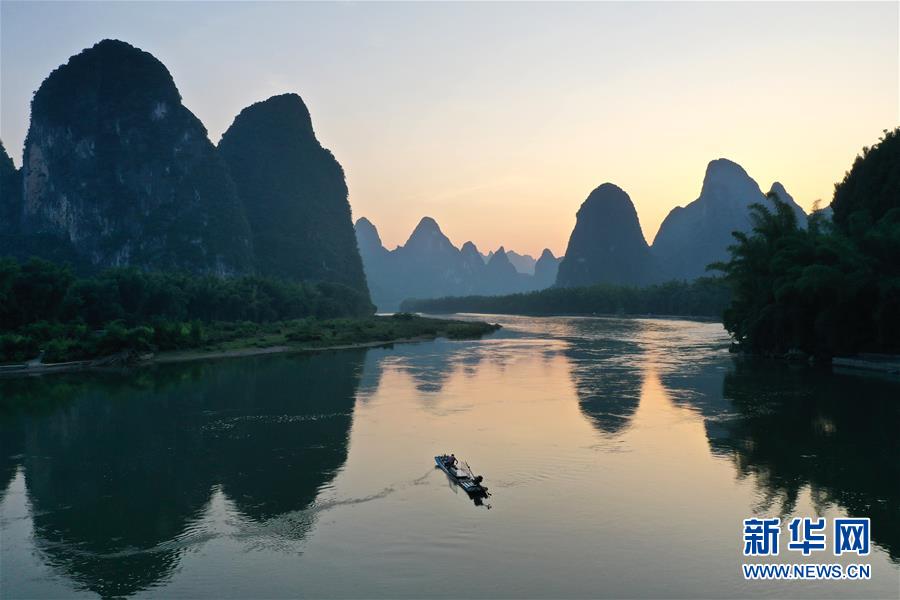 這是在廣西桂林市陽朔縣興坪鎮拍攝的山水風光(5月19日攝)。“蒼蒼森八桂,茲地在湘南。江作青羅帶,山如碧玉篸……”一千多年前,唐朝詩人韓愈寫盡桂林山水之美。初夏時節,在廣西桂林市陽朔縣興坪鎮,藍天白云下,煙雨朦朧中,桂林山水盡顯秀美。新華社記者 崔博文 攝