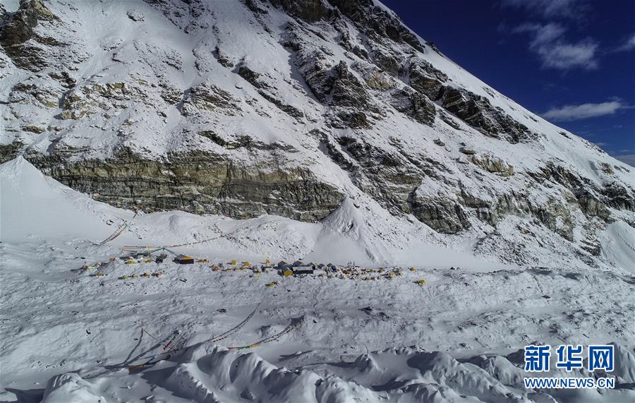 位于珠峰東絨布冰川旁海拔6500米的珠峰前進營地(5月22日攝,無人機照片)。新華社記者晉美多吉攝