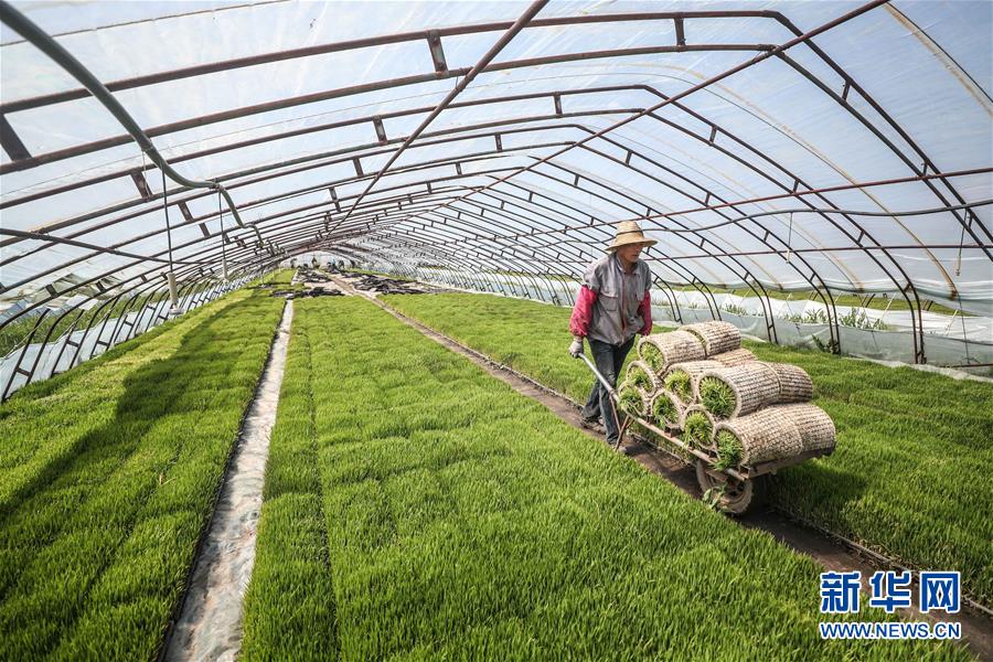 5月24日,盤錦市大洼區的農民在育苗棚內搬運符合插秧標準的水稻秧苗。新華社記者潘昱龍攝