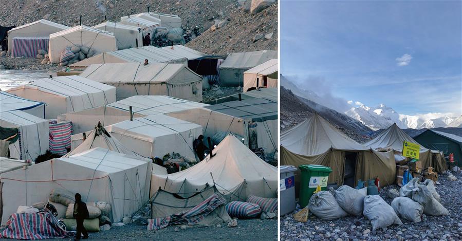 拼版照片:左圖為2005年的春季登山季,為測量、登山和科考等隊伍提供服務保障的當地群眾在珠峰大本營搭起的帳篷(資料照片)。新華社記者索朗羅布攝右圖為2020珠峰高程測量活動中,曾經被視為登山隊最好的帳篷變成了垃圾集中存放處。新華社記者普布扎西攝