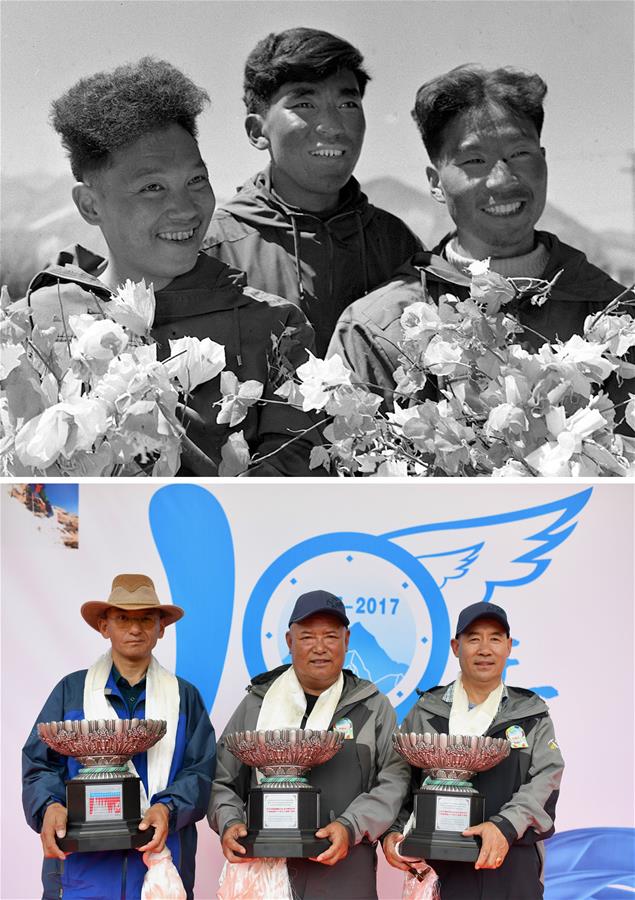 拼版照片:上圖為1960年6月7日,人類歷史上首次從北坡登頂珠峰的中國登山隊隊員王富洲(右)、貢布(中)與屈銀華三人凱旋拉薩后捧花合影(資料照片)。新華社發下圖為2017年7月12日,在紀念西藏登山隊成功登頂世界14座海拔8000米以上高峰10周年儀式上,隊員次仁多吉(中)、邊巴扎西(左)和洛則獲頒紀念獎杯。新華社記者普布扎西攝