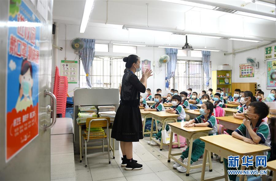 5月25日,廣州市荔灣區蔣光鼐紀念小學的老師在教學生防疫知識。當日,廣州市各小學一至三年級學生正式開學復課。至此,廣州市中小學各年級已全部開學復課。新華社記者盧漢欣攝