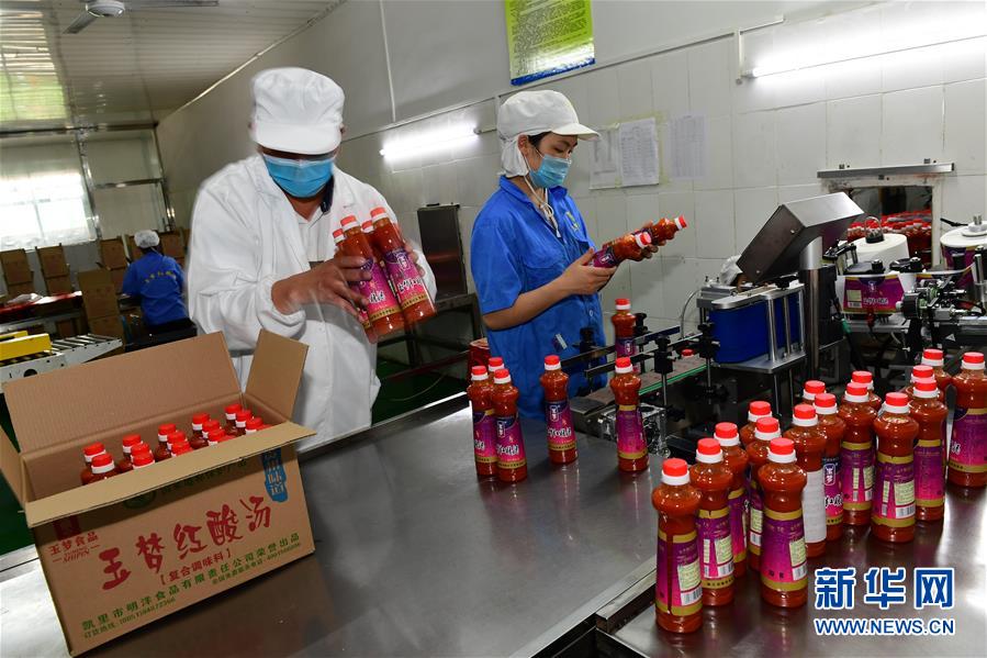 5月26日,在貴州省黔東南苗族侗族自治州麻江縣明洋食品公司生產車間,工人將制作好的古法酸湯裝箱。新華社記者楊楹攝