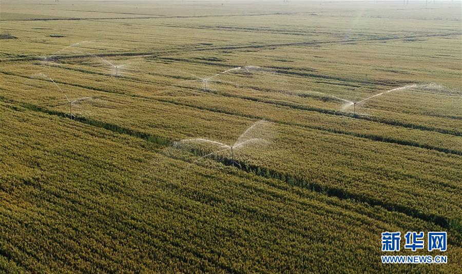 5月26日,內丘縣中程村麥田的噴灌設備在澆灌小麥(無人機照片)。夏日時節,河北省邢臺市內丘縣農民搶抓農時開展麥田后期管理,為小麥增產豐收打好基礎。新華社記者朱旭東攝