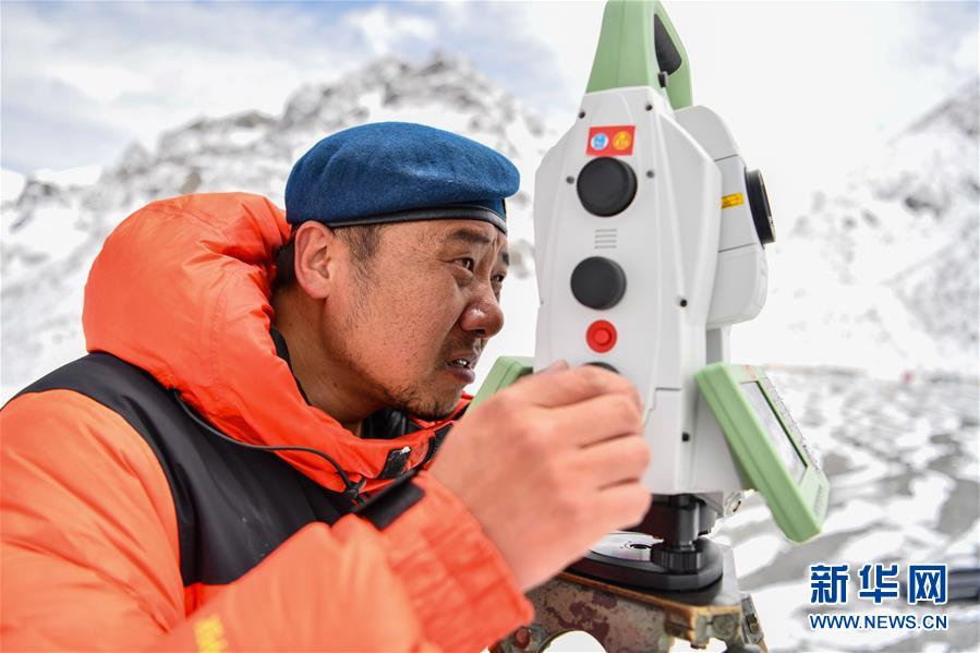 當(dāng)日,2020珠峰高程測量登山隊(duì)成功登頂后,在珠峰大本營的珠峰高程起算點(diǎn),自然資源部第一大地測量隊(duì)隊(duì)員利用全站儀等儀器對(duì)珠穆朗瑪峰峰頂進(jìn)行交會(huì)觀測。