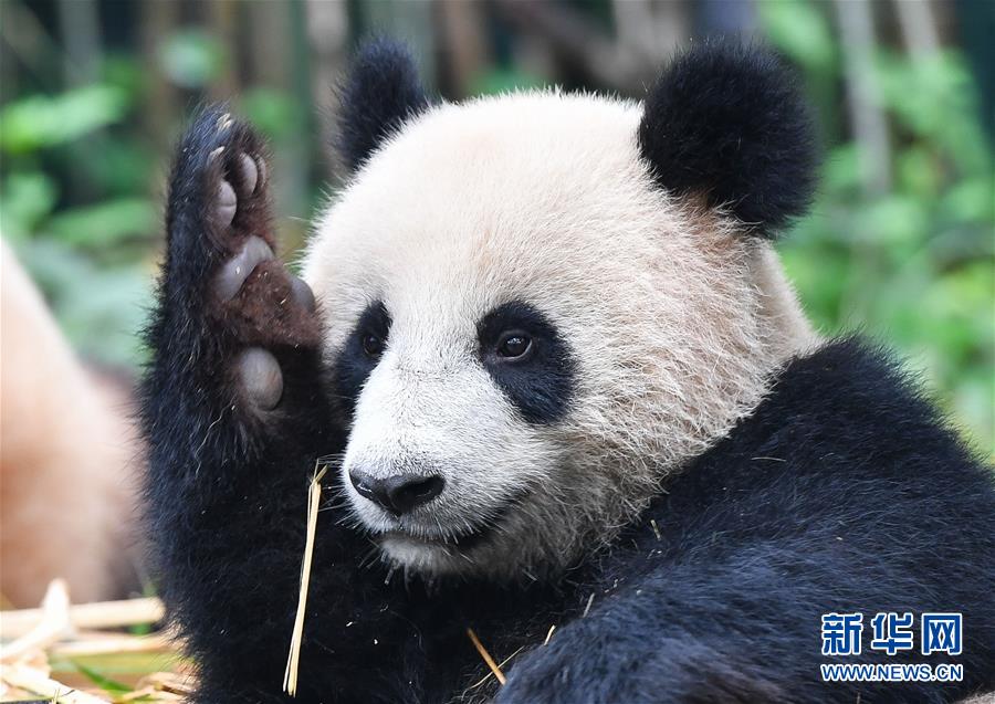 5月27日,被搶走竹子的大熊貓婷仔“舉手”望向飼養員。正在享受竹子大餐的廣州長隆野生動物世界大熊貓婷仔被大熊貓隆仔搶食,兩只大熊貓上演一場爭食戲碼。新華社記者劉大偉攝