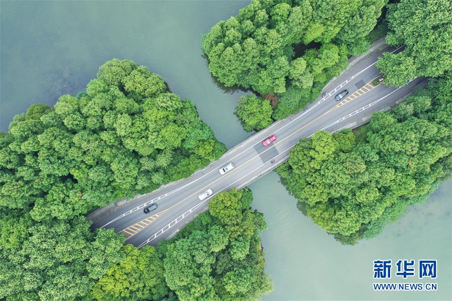 5月27日,車輛行駛在西湖楊公堤上(無人機照片)。隨著氣溫升高,杭州西湖綠意蔥蘢,展現出柔美的湖光山色。新華社記者翁忻旸攝