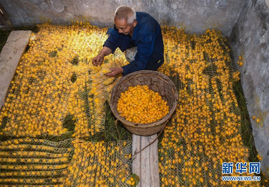 5月27日,桐鄉市鳳鳴街道建勝村70歲的村民宋柏明在收獲“黃金繭”。他今年在桐鄉興民蠶業專業合作社的指導下首次養3張黃金蠶繭種,收獲“黃金繭”近400斤,比往年同期增收1500元。近期,蠶桑之鄉浙江省桐鄉市的蠶農們迎來了蠶繭豐收的季節,其中新品種“黃金繭”的增收效果尤其明顯。據介紹,與普通蠶絲相比,色澤金黃的黃金蠶絲中葉黃素含量高,抗菌效果更好,深受市場青睞。2020年春季,浙江省桐鄉市共計發放黃金蠶繭種1225張,產量預計75噸,總產值近300萬元,較普通蠶繭增收約20%,成為當地農業增收的亮點。浙江省桐鄉市是我國蠶桑的重要產地,“桐鄉蠶桑習俗”也被國務院列入第二批國家級非物質文化遺產名錄。新華社記者徐昱攝