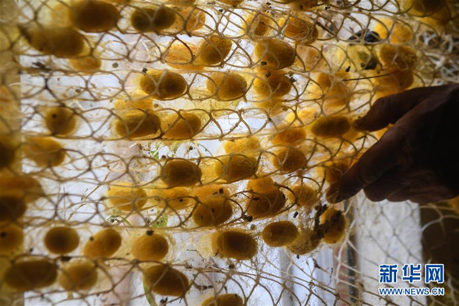 5月27日,桐鄉市鳳鳴街道建勝村70歲的村民宋柏明在收獲“黃金繭”。新華社記者徐昱攝