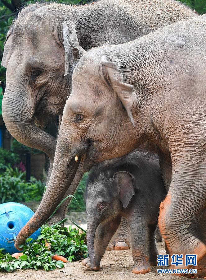 5月27日,廣州長(zhǎng)隆的新生亞洲象寶寶與媽媽寸步不離。新華社記者劉大偉攝