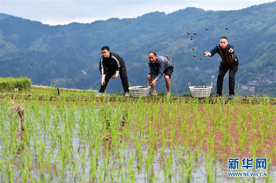 5月26日,貴州省黔東南州住建局派駐從江縣加榜鄉加車村的幫扶干部(左一、右一)幫助村民一起播撒種螺。