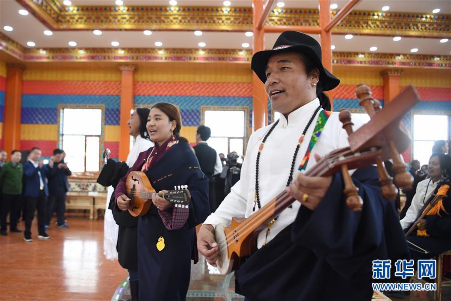 幾名藏族歌手在甘南藏族自治州瑪曲縣阿萬(wàn)倉(cāng)鎮(zhèn)沃特村的文化演藝大廳內(nèi)為游客彈唱(5月25日攝)。新華社記者陳斌攝