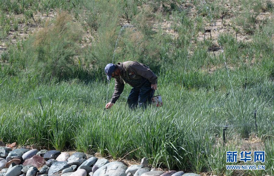 5月28日,工人在巴丹吉林鎮生態修復項目南部河道附近修理噴灌設備,以節約用水。2017年以來,內蒙古阿拉善右旗在巴丹吉林鎮開展生態修復項目,種植適合在當地生長的馬蓮、紅柳等植物,修復生態的同時也起到美化作用。巴丹吉林鎮是巴丹吉林沙漠旅游景區的游客集散地,這里常年干旱少雨,水資源匱乏。新華社記者徐欽攝