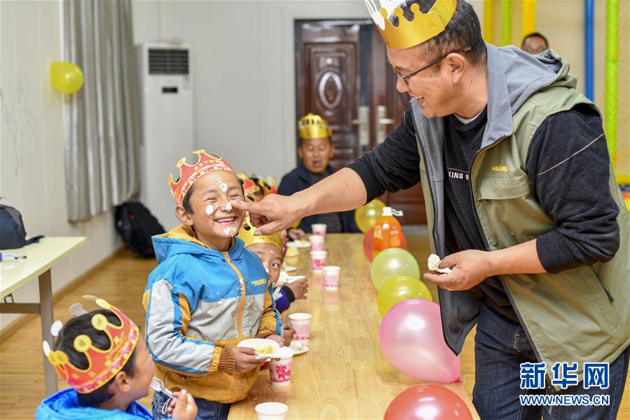 5月27日,玉麥鄉(xiāng)小學校長朗杰和孩子們一起慶祝“生日”。新華社記者王炳坤攝
