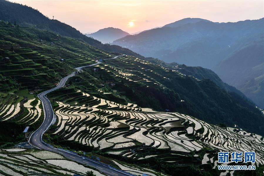 晨光中的從江縣加榜鄉加車梯田(5月28日攝)。夏日時節,位于貴州省黔東南苗族侗族自治州從江縣加榜鄉加車、加頁、黨扭等苗寨的梯田在晨霧與陽光的映襯下線條分明,光影變幻,景色如畫。新華社記者 楊文斌 攝