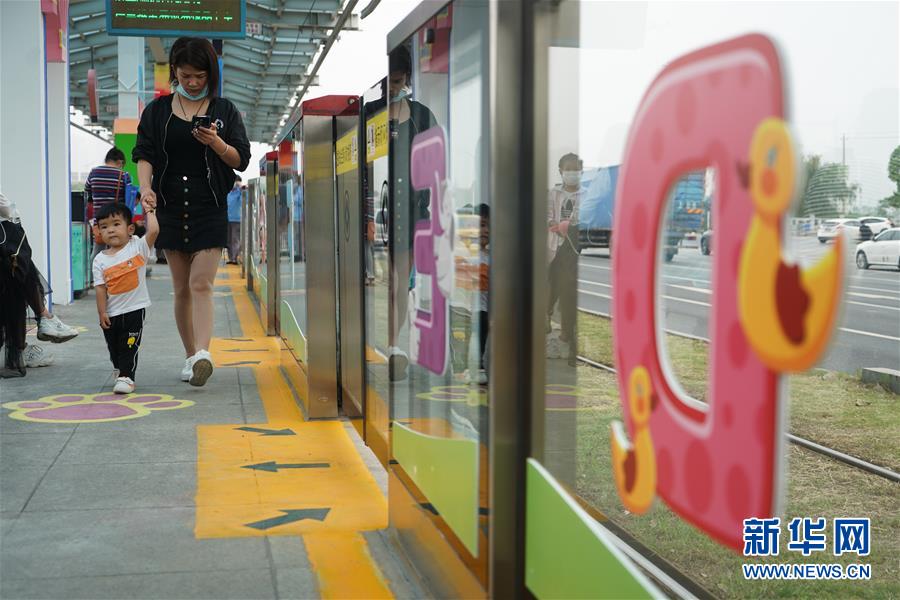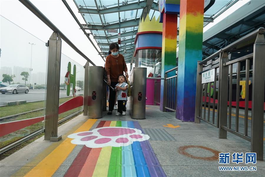5月31日,乘客在南京市建鄴區河西新城有軌電車友誼街站候車。“六一”國際兒童節前夕,江蘇省南京市建鄴區河西新城有軌電車友誼街站裝扮一新,站臺上的城堡、熱氣球等充滿童趣的元素讓乘客仿佛置身“童話世界”。該站臨近南京市兒童醫院河西院區,家長和兒童乘客較多。新華社記者季春鵬攝