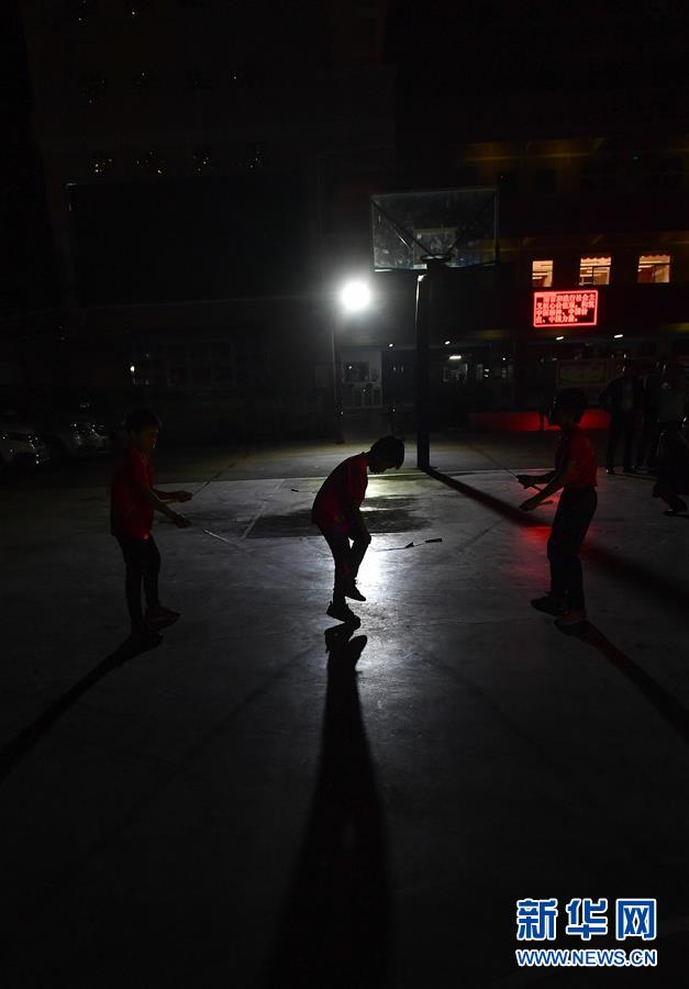 鐘煒鋒在校園小廣場上和同學練跳繩,當天晚上,電影《點點星光》將在七星小學操場上舉行首映式(2019年11月15日攝)。新華社記者劉大偉攝