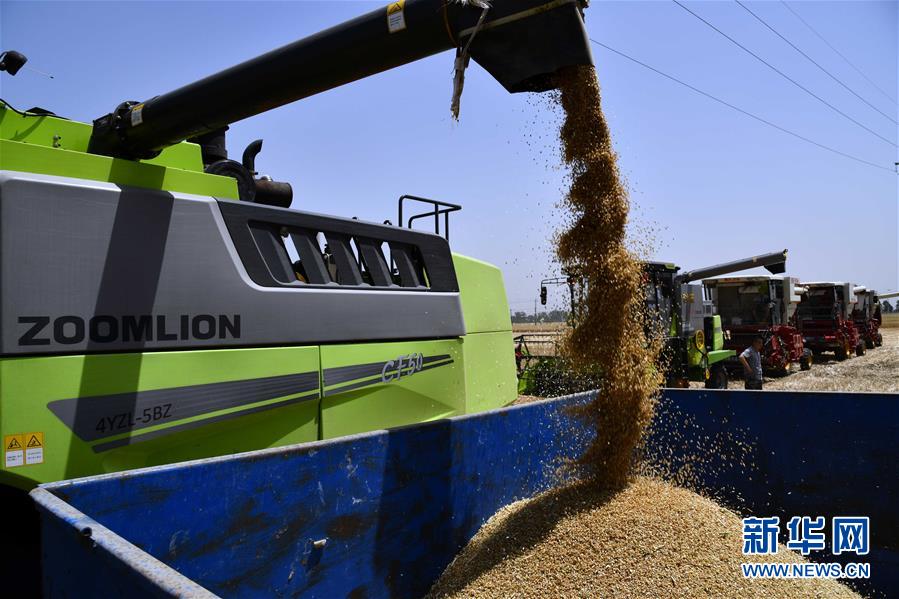 6月3日,在汶上縣郭倉鎮,收割機在收獲小麥。目前,我國第二大小麥主產區山東6000多萬畝小麥進入收獲階段。農民們搶抓有利天氣,自南向北陸續開鐮。新華社記者郭緒雷攝。