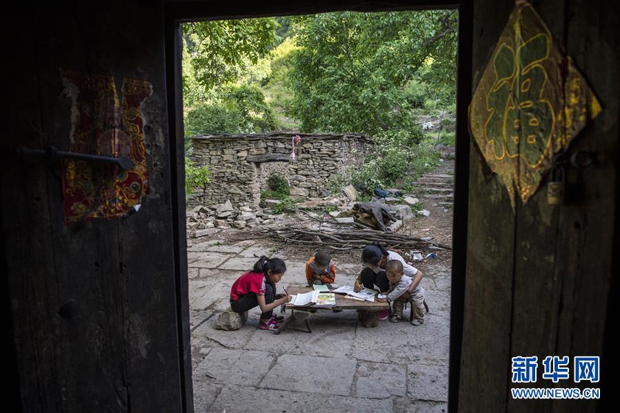 秦春蘭(右二)、秦秋蘭(左一)和秦興旺(左二)在南背村的家里學習(5月31日攝)。新華社記者楊晨光攝。