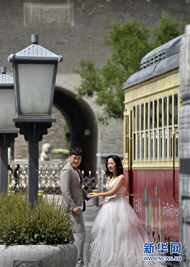 6月3日,一對年輕人在前門步行街拍攝婚紗照片。近日,游人和市民紛紛來到北京市的王府井、西單、前門大街等著名商業街購物休閑,這些老商業街開始逐步恢復昔日的繁華。新華社記者李欣攝。