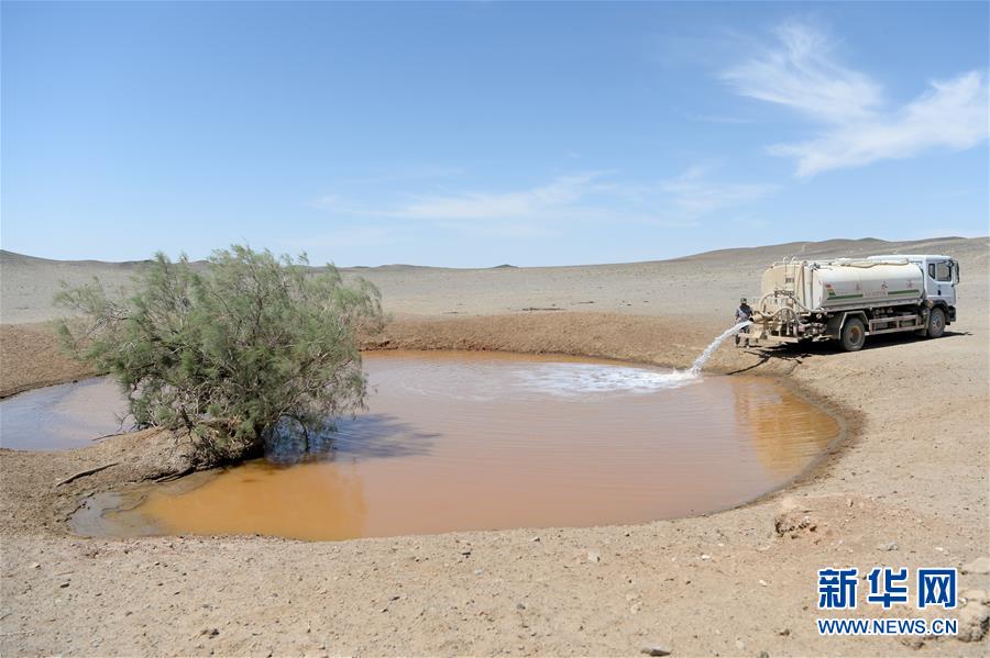 在新疆卡拉麥里山有蹄類野生動物自然保護區,管護員為水源地灌水(6月3日攝)。新華社記者丁磊攝。