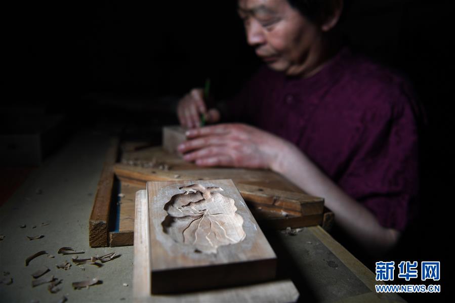 5月20日,安徽省非物質文化遺產徽墨代表性傳承人項德勝在雕刻墨模。新華社記者劉軍喜攝。