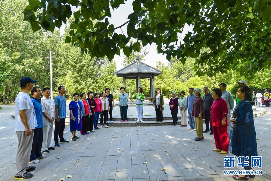 6月5日,市民在文安縣水景公園內練習合唱。近年來,河北省文安縣將植樹造林與城市建設有機融合,探索“政府引導、企業運作、多方共贏”的市場化植樹造林新模式,大規模推進國土綠化,打造人與自然和諧共生的優美生態環境,構筑京津雄綠色屏障。截至目前,該縣森林覆蓋率已經達到33%,城區綠地面積達到36.48%。新華社記者李曉果攝。