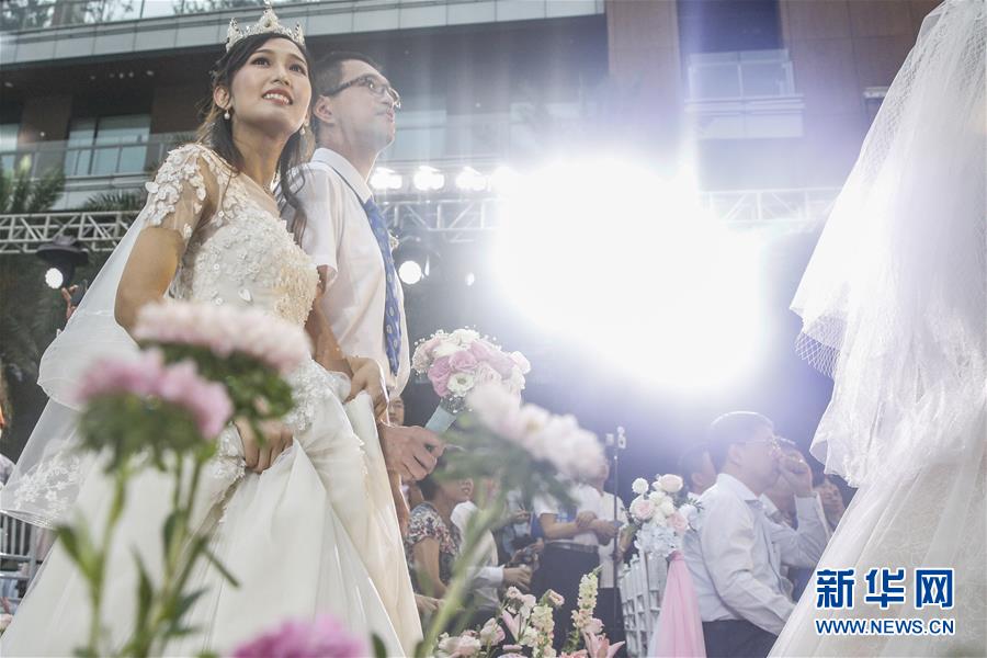 6月6日,新人在海南博鰲樂城國際醫療旅游先行區參加集體婚禮。 新華社記者 張玉薇 攝