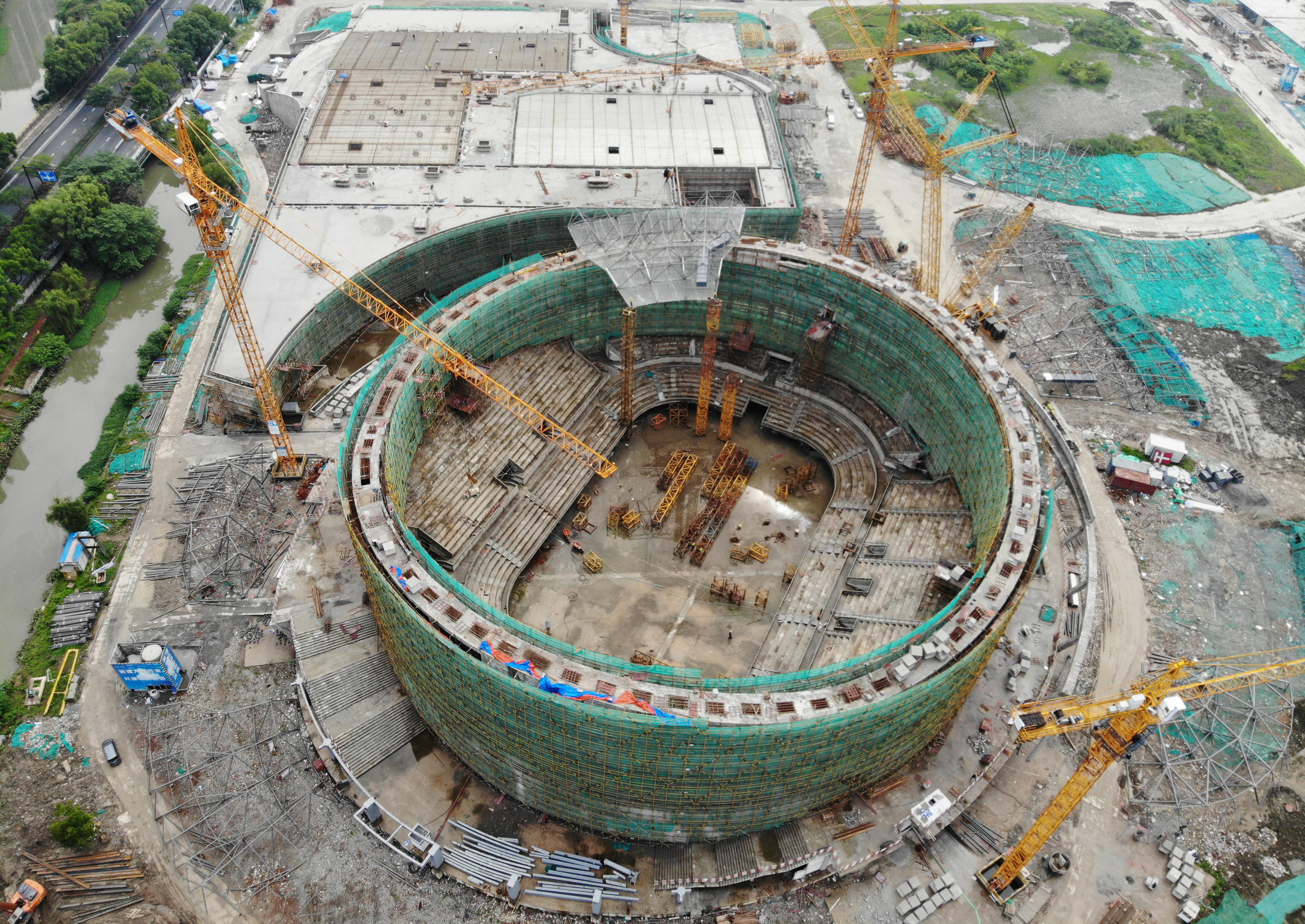 2020年6月9日,從空中俯瞰正在建設中的杭州亞運會乒乓球館。近日,位于杭州運河亞運公園內的乒乓球館主體結構完工,開始進入自支撐鋼斜肋系統玻璃立面安裝階段。據了解,杭州亞運會乒乓球館占地1.94萬平方米,將建成12片標準乒乓球場地,并可容納5000-6500位觀眾。該乒乓球館設計靈感來源于杭州良渚文化中的“玉文化”,采用了“琮”的樣子。