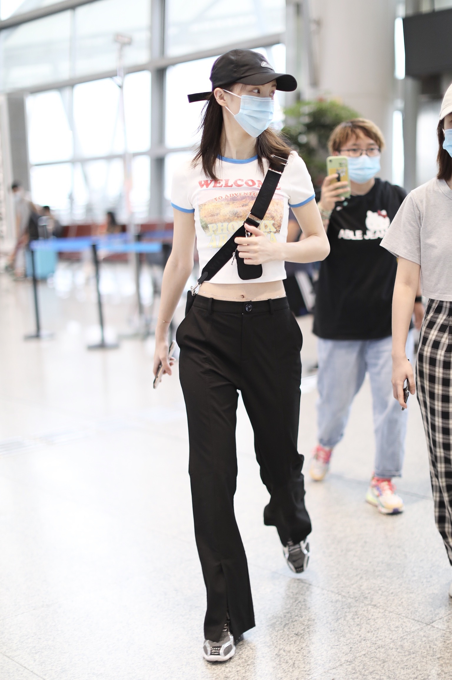 2020年6月9日,湖南長沙,金晨現身機場。大清早出現的她狀態不錯,戴著棒球帽身著超短白T,大秀水蛇腰及腰鏈,一路心情超好,更不時笑成月牙眼!