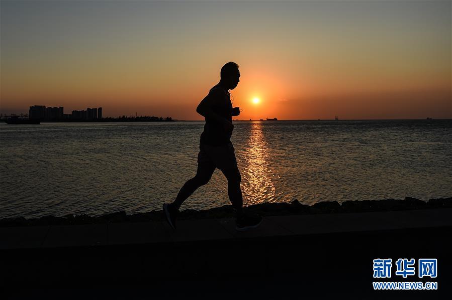 夜幕將至,一位市民在海口世紀公園濱海步道跑步(5月15日拍攝)。近年來,夜跑成為越來越多都市人熱衷的健身方式之一。在海南海口,每當夜幕降臨,“夜跑族”來到海口萬綠園、世紀公園等夜跑場所跑步,用一身酣暢淋漓的汗水擺脫白天工作中的壓力,享受跑步帶來的歡愉。新華社記者 蒲曉旭 攝