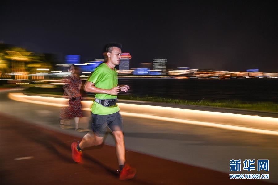 市民在海口萬綠園夜跑(5月28日拍攝)。近年來,夜跑成為越來越多都市人熱衷的健身方式之一。在海南海口,每當夜幕降臨,“夜跑族”來到海口萬綠園、世紀公園等夜跑場所跑步,用一身酣暢淋漓的汗水擺脫白天工作中的壓力,享受跑步帶來的歡愉。新華社記者 蒲曉旭 攝