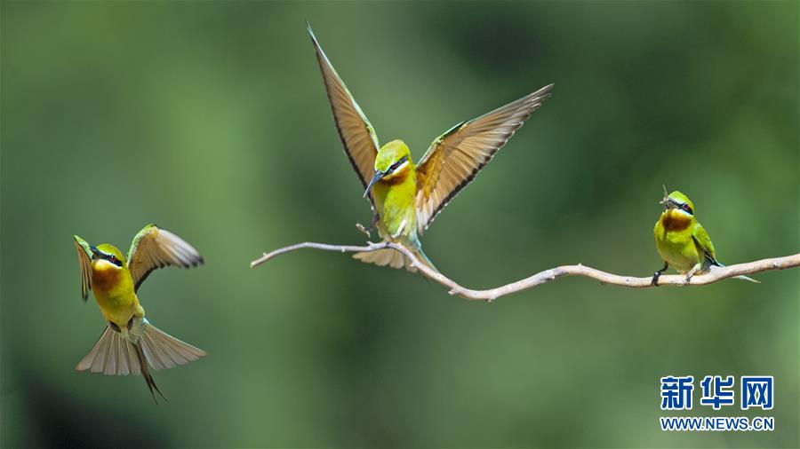 栗喉蜂虎在福建省晉江市深滬鎮科任村一山坡上覓食嬉戲(6月12日攝)。入夏以來,逾百只栗喉蜂虎飛臨閩南晉江市深滬鎮科任村筑巢棲息。新華社記者記者梅永存攝。