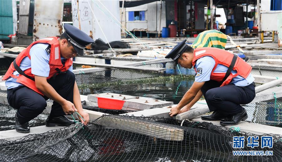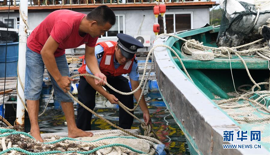 6月13日,海南省公安廳海岸警察總隊(籌備組)陵水支隊民警幫助轄區內漁民固定漁排。當日,海南省氣象局于16時30分繼續發布臺風四級預警。今年第2號臺風“鸚鵡”(熱帶風暴級)預計于14日在廣東沿海登陸。新華社記者楊冠宇攝。