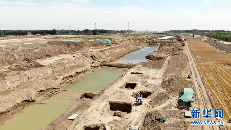 這是6月14日拍攝的山東小清河章丘段考古發掘現場(無人機照片)。近日,濟南市考古研究所考古工作隊在對小清河章丘段進行考古調查和勘探時,發現了13座年代集中在北朝末期至唐朝初期的古墓。新華社記者 王凱 攝