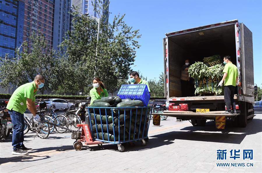 6月14日,在北京市海淀區的超市發雙榆樹店門口,工作人員在搬運蔬菜。  新華社記者 任超 攝