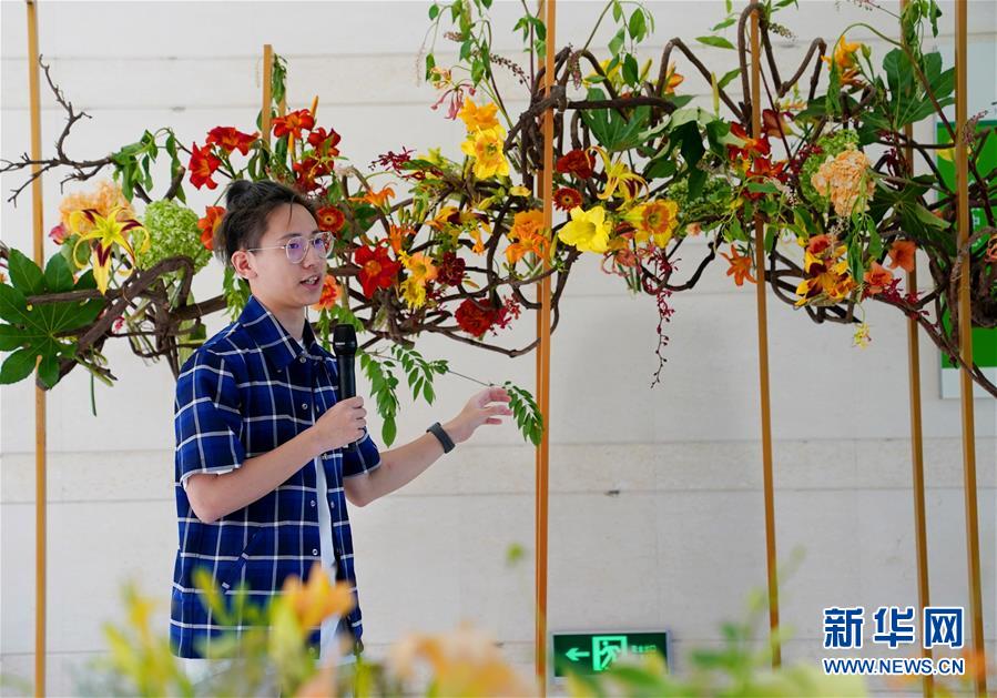 6月13日,第45屆世界技能大賽花藝項目冠軍、上海應用技術大學學生陸亦煒在介紹自己主持設計和創作的花藝作品。當日,“2020中國(上海)萱草文化節”在上海應用技術大學開幕,校園里數百個品種的萱草花競相綻放,萱草科研推廣、萱草文化交流等多項活動同時舉行。新華社記者 劉穎 攝