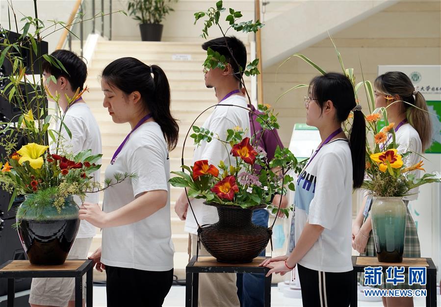 6月13日,上海應用技術大學的學生們設計創作的萱草花藝作品即將在開幕式現場亮相。當日,“2020中國(上海)萱草文化節”在上海應用技術大學開幕,校園里數百個品種的萱草花競相綻放,萱草科研推廣、萱草文化交流等多項活動同時舉行。新華社記者 劉穎 攝