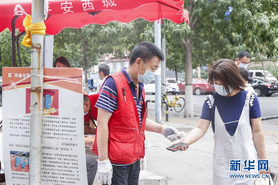 6月17日,居民在北京市西城區廣外街道小馬廠東社區的入口測量體溫。新華社記者 張玉薇 攝