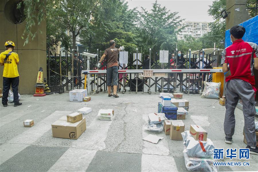 6月17日,快遞員在北京市西城區廣外街道朗琴園社區外為一位居民遞送包裹。