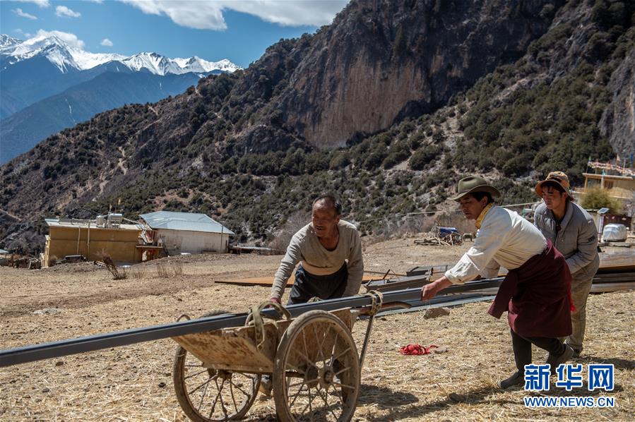 德欽縣佛山鄉江坡村說打村村民斯那定主(中)和村民一起搬運建筑材料(3月14日攝)。新華社記者 胡超 攝