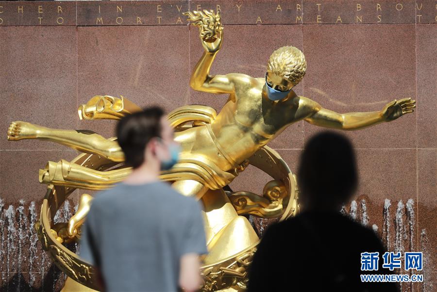 6月22日,在美國紐約洛克菲勒中心,一座雕像被“戴”上口罩。美國約翰斯·霍普金斯大學22日發布的新冠疫情最新統計數據顯示,美國累計死亡病例超過12萬例。新華社記者王迎攝