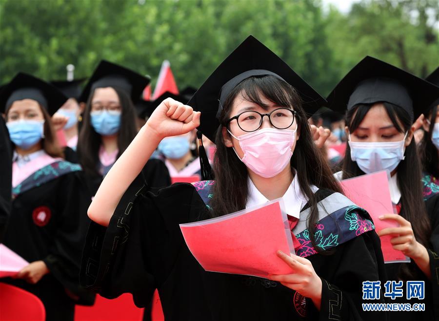 6月23日,在華東師范大學(xué)閔行校區(qū)的畢業(yè)典禮上,師范專業(yè)的畢業(yè)生舉行宣誓儀式。當(dāng)日,華東師范大學(xué)舉行2020屆畢業(yè)典禮。由于疫情防控需要,今年的典禮在兩個(gè)校區(qū)分別舉辦,并全程在線直播。約7700名華東師范大學(xué)2020屆畢業(yè)生通過現(xiàn)場或“云端”的方式參加畢業(yè)典禮。新華社記者劉穎攝