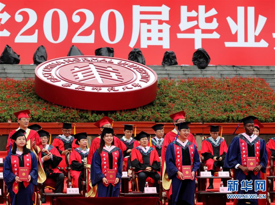 6月23日,在華東師范大學閔行校區的畢業典禮上,優秀畢業生代表接受表彰。當日,華東師范大學舉行2020屆畢業典禮。由于疫情防控需要,今年的典禮在兩個校區分別舉辦,并全程在線直播。約7700名華東師范大學2020屆畢業生通過現場或“云端”的方式參加畢業典禮。新華社記者劉穎攝