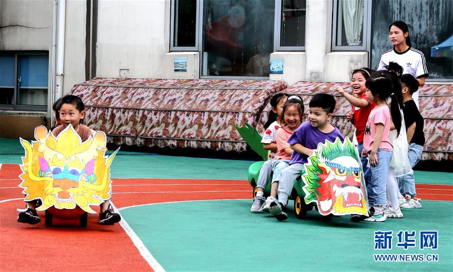 6月23日,長興縣李家巷鎮中心幼兒園的孩子們一起在玩自創“劃龍舟”游戲。為了迎接即將到來的端午節,浙江省湖州市長興縣各個幼兒園開展“品民俗迎端午”主題活動,讓小朋友們體驗傳統民俗文化。新華社記者徐昱攝
