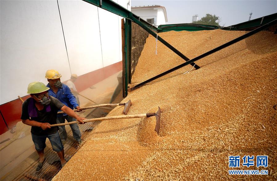 6月23日,在河北柏鄉國家糧食儲備庫,工作人員在查看小麥質量。麥收過后,河北柏鄉國家糧食儲備庫積極騰倉納糧,做好夏糧收儲入庫工作,確保農民順利賣糧。新華社記者王曉攝