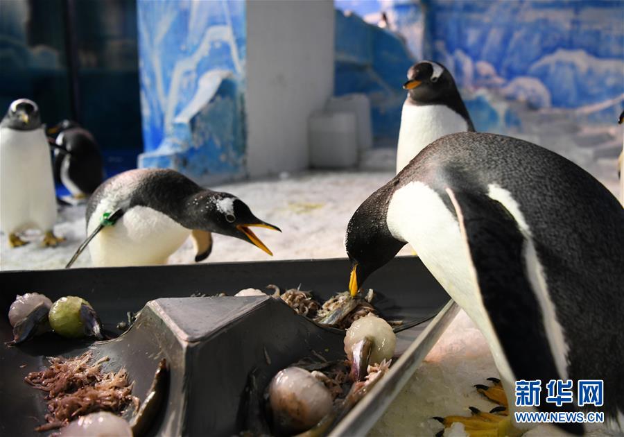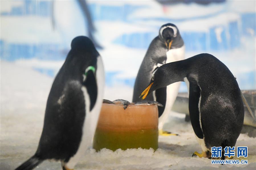 6月24日,哈爾濱極地館的企鵝在享用工作人員送來的美食。當日,哈爾濱極地館的工作人員特地準備了“魚粽”“肉粽”,讓生活在這里的極地動物也品嘗一下端午美食。新華社記者王建威攝