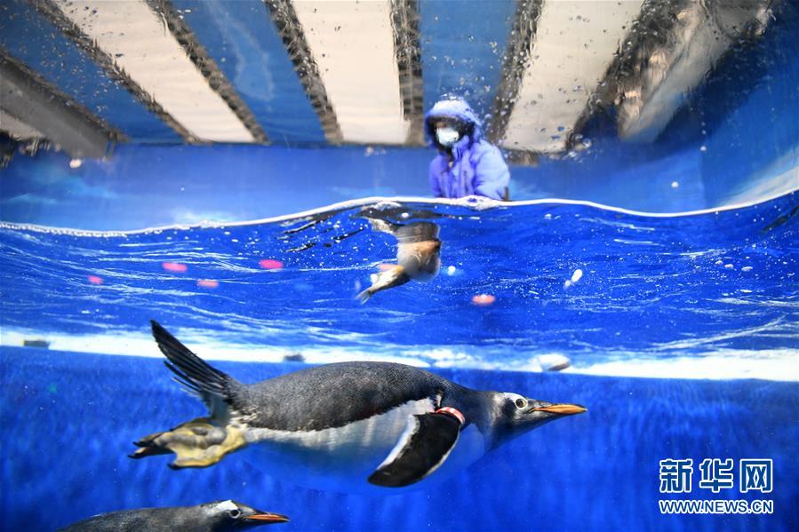 6月24日,哈爾濱極地館的工作人員為水中的企鵝投放“魚粽”。當日,哈爾濱極地館的工作人員特地準備了“魚粽”“肉粽”,讓生活在這里的極地動物也品嘗一下端午美食。新華社記者王建威攝