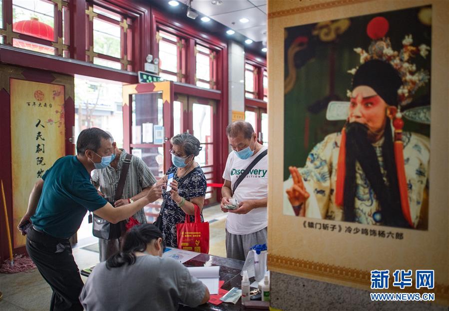 6月26日,市民掃健康碼登記后進入武漢市人民劇院。當日,武漢市中心7家劇場恢復開放,各大文藝院團恢復線下演出,市民再次坐在劇場內觀看“戲碼頭”上群星云集、百戲薈萃。新華社記者 肖藝九 攝